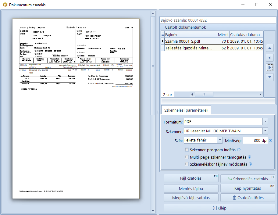 A gyors dokumentum csatolás érdekében lehetőség van a szkennerben lévő dokumentum egy gombnyomásos szkennelésére és az aktuális bizonylathoz csatolására. A szkennelési paramétereket egyszer be kell állítani, azok a következő megnyitáskor automatikusan betöltődnek és már indulhat is a szkennelés!
